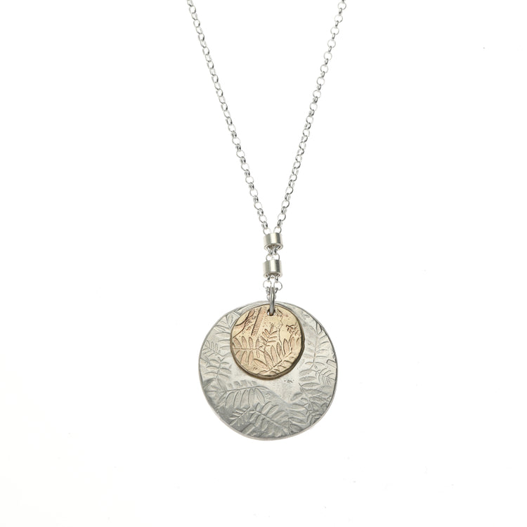 Silver large pendant and 9ct yellow gold smaller pendant on silver chain